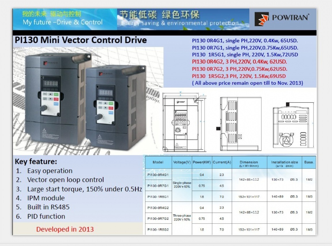 - PI130 mini sensorless vector control inverter
