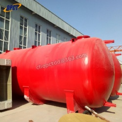 FRP Horizontal tank, also called FRP horizontal vessel, is a device composed by leakage-resistant and anti-corrosion inner layer, firm structural layer, anti-aging outer layer, heads, nozzles, and saddle supports. FRP (Fiberglass Reinforced Plastic), its raw material, is a special kind of plastic which has been reinforced with fiberglass, similar to the way that rebar strengthens concrete. FRP Horizontal tank is a perfect choice when you are in need for storage tank but have a vertical height limitation. By using filament winding method, the material of horizontal FRP tank can be reinforced to adjust its physicochemical ability and meet different requirements.