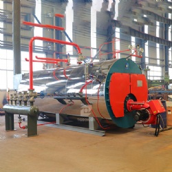 WNS series horizontal internal combustion boiler is a boiler shell type 3 passes wetback oil/gas fired boiler. After fuel is being atomized by burner, flame is full of the wave furnace and transfer heat via furnace wall, this is 1st pass; the high temperature smoke is collected in reversal chamber and then enters 2nd pass which is grooved tubes bundle area; after heat convection, air temperature gradually falls and goes to front smoke box and turn to 3rd pass, which is smooth tubes bundle area, and then enters chimney passing back smoke box and exhausted to the atmosphere.
